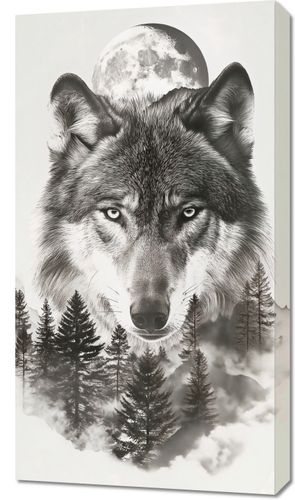 Obraz z serii natura zatytułowany Wilczy Duch Lasu przedstawia majestatyczną głowę wilka, której intensywne, przenikliwe oczy wydają się patrzeć prosto w duszę widza. Tło w odcieniach bieli i szarości tworzy iluzję mgły, która otula sylwetki drzew i zarysy gór. Ponad wilkiem unosi się pełnia księżyca, która rozświetla nocne niebo, dodając kompozycji tajemniczego i mistycznego charakteru. Ten obraz idealnie wpasuje się w przestrzeń miłośnika natury, wzbogacając każde pomieszczenie o element dzikiego i surowego piękna. Dzięki swojej symbolicznej sile i głębi będzie nie tylko dekoracją, ale również źródłem inspiracji i kontemplacji. Idealnie sprawdzi się w salonach, przestrzeniach wspólnych, bibliotekach, a także jako punkt centralny w galerii sztuki czy prywatnym biurze.