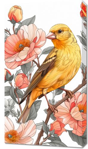 Obraz z serii natura zatytułowany Wiosenny Śpiewaczek przedstawia pełną detali i życia scenę, w której jaskrawo żółty ptak, przypominający kanarka, spoczywa na gałęzi wśród kwitnących kwiatów. Delikatne i subtelne kolory kwiatów w pastelowych odcieniach różu i pomarańczu tworzą miękki kontrast do żywego upierzenia ptaka. Precyzyjne linie i staranne cieniowanie nadają ilustracji realistycznego wyglądu, a roślinność w tle jest równie szczegółowo wykonana, co dodaje kompozycji głębi i bogactwa. Ten obraz to celebracja wiosennego odrodzenia i piękna natury, idealny do ożywienia każdego wnętrza, szczególnie pokoju dziennego, przestrzeni odpoczynkowej lub kawiarni o przytulnej atmosferze.