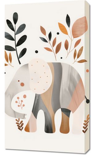 Obraz z serii wnętrza zatytułowany Wypocznij Mały przedstawia stylizowaną ilustrację słonia, wplecionego w delikatną kompozycję z abstrakcyjnymi elementami roślinnymi. Słoń jest przedstawiony w spokojnej, stonowanej palecie kolorów z akcentami ciepłych brązów, beżów i delikatnych szarości, co nadaje ilustracji elegancki i nowoczesny charakter. Proste, ale efektowne formy roślinne wokół słonia dodają plakatowi lekkości i harmonii, a dyskretne kropki i linie na ciele słonia tworzą wrażenie tekstury. Całość tworzy obraz spokoju i łagodności, idealny do wnętrz, w których chce się wprowadzić elementy natury i uspokajającej estetyki, takich jak salony, pokoje relaksacyjne lub przestrzenie dla dzieci.