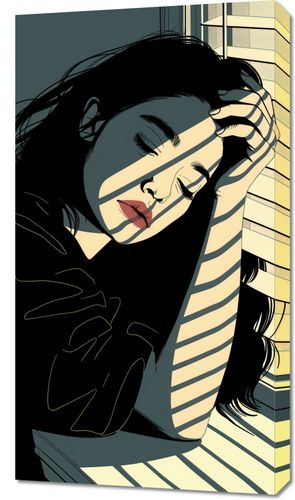 Obraz z serii abstrakcja zatytułowany Zamysł. Obraz przedstawia kobietę z zamyślonym wyrazem twarzy, z głową opartą na dłoni, co sugeruje moment introspekcji lub smutku. Silne cienie i linie świetlne tworzące prążki na jej twarzy dodają głębi kompozycji, a kontrastująca paleta kolorów z dominującymi odcieniami niebieskiego i czerni, podkreślona akcentem czerwieni ust, potęguje emocjonalne napięcie dzieła. Ten obraz może symbolizować skomplikowane emocje ludzkiego doświadczenia i jest idealnym dodatkiem do przestrzeni, które cenią sobie głębię i wyrazistość w sztuce, takich jak salon, studio twórcze, czy miejsce do medytacji.