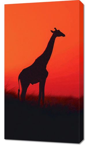 Obraz z serii natura zatytułowany Żyrafa w Czerni. Przedstawia majestatyczną sylwetkę żyrafy na tle zachodzącego słońca. Intensywny czerwony kolor nieba tworzy dramatyczne tło dla czarnej sylwetki, która wyłania się wśród wysokich traw sawanny. Subtelny gradient czerwieni przywołuje ciepło afrykańskiego słońca i dzikość naturalnego środowiska. Obraz idealnie oddaje esencję dzikiej przyrody i będzie pięknym dodatkiem do każdego wnętrza, przyciągając wzrok i inspirując do marzeń o podróżach. Doskonale pasuje do salonów w stylu etno, przestrzeni publicznych związanych z podróżami oraz pokojów o tematyce przyrodniczej.