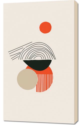 Obraz z serii boho zatytułowany Centralne Słońce to dzieło artystyczne utrzymane w stonowanej palecie kolorystycznej, na którym dominują geometryczne kształty i linie. Na górnej części kompozycji widnieje małe, jaskrawe czerwone koło, które może symbolizować słońce lub inny punkt centralny. Poniżej znajduje się czarna, półokrągła forma z koncentrycznymi liniami, przypominającymi ułożenie naturalnych warstw kamienia lub drzewa. Tuż obok, kontrastujące z nią, znajduje się większe, jasno beżowe koło, które wraz z czarnym półkolem tworzy iluzję przestrzeni. Na dole obrazu uwagę przyciąga większe, okrągłe pole w odcieniu ciepłego pomarańczu, na którym znajduje się wzór pasków w kierunku pionowym, dodający tekstury i ruchu. Całość utrzymana jest w estetyce minimalizmu i modernizmu, gdzie każdy element, choć prosty, jest starannie wyważony, by współgrać z resztą kompozycji.