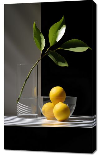 Obraz z serii wnętrza zatytułowany Cytrusowa Aranżacja . Ten obraz prezentuje minimalistyczną aranżację składającą się z jasnych, soczystych cytryn ułożonych w przezroczystej misce, akompaniowanych przez pojedynczą, zieloną gałązkę delikatnie wystającą z wysokiego szklanego naczynia. Kompozycja ta, umieszczona na kontrastującym tle, z subtelnymi cieniami i odbiciami światła, sprawia, że scena tętni życiem, mimo swojej prostoty. Idealny do nowoczesnych kuchni, jadalni lub jako odświeżający akcent w przestrzeniach biurowych, ten plakat wnosi element naturalności i czystości do każdego wnętrza.