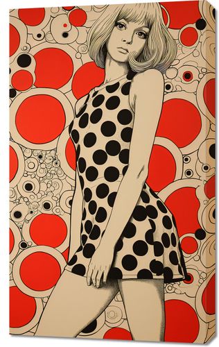 Obraz z serii pop art zatytułowany Czerwone Kropki. Prezentuje modną kobietę w czarnej sukience w białe kropki, która pozuje na tle żywego, czerwonego tła z abstrakcyjnym wzorem kołowym. Jej postać i suknia są przedstawione w odcieniach czerni i szarości, co tworzy silny kontrast z tłem. Obraz oddaje ducha epoki pop-artu, łącząc minimalistyczny portret z dynamicznym i odważnym wzorem. Idealnie wpasuje się w nowoczesne wnętrza oraz przestrzenie kreatywne, takie jak studia projektowe, galerie sztuki czy modowe butiki.