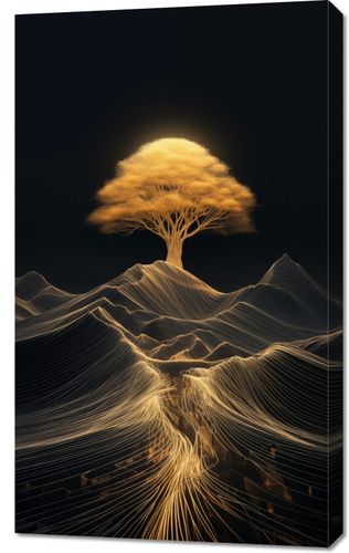 Obraz z serii abstrakcja zatytułowany Drzewo Energii. Przedstawia on hipnotyzujący widok drzewa, którego korony i korzenie są ukazane jako sieć płynących linii światła, symbolizujących życie i energię. Kontrastujące z ciemnym niebem, linie świetlne tworzą efekt wizualny przypominający połączenie natury z energią. Dzieło to łączy w sobie piękno naturalnych form z abstrakcyjnym wyrazem, nadając mu głębię i metaforyczne znaczenie. Obraz ten jest idealnym wyborem dla przestrzeni, które pragną wprowadzić elementy inspirujące do refleksji nad życiem, naturą i jej niewidzialnymi więziami.