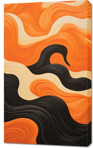 Obraz z serii abstrakcja zatytułowany Dzień spotyka Noc. Falujące wzory przypominają o zachodach słońca na horyzoncie, gdzie słońce zanika za krętą linią nocy. Wzory w odcieniach pomarańczu i złota ścierają się z głęboką czernią, tworząc harmonijną grę świateł i cieni. Te przenikające się kolory dodają obrazowi energii i dynamiki, prowadząc nas przez krajobraz zmieniającego się dnia. Kontrast pomiędzy ciepłymi i chłodnymi tonami przyciąga wzrok i wciąga w głąb kompozycji. Idealny dla nowoczesnych kawiarni, artystycznych przestrzeni oraz domowych salonów pragnących wprowadzić nutę spokoju i refleksji.