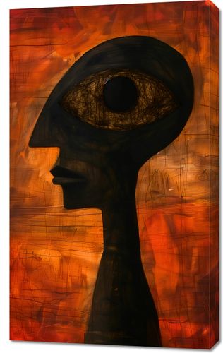 Obraz z serii abstrakcja zatytułowany Głęboki Wgląd przedstawia enigmatyczną sylwetkę o ludzkiej formie z dominującym, przeskalowanym okiem w miejscu głowy, wpatrującym się w widza z niezwykłą intensywnością. Tło obrazu jest abstrakcyjne, z bogatymi pociągnięciami pędzla w ciepłych odcieniach czerwieni i pomarańczy, sugerujące płomienne otoczenie lub burzliwe emocje. Sylwetka postaci jest zarysowana w głębokim czernią, co kontrastuje z jaskrawym tłem, a tekstura przypominająca sieć w obrębie oka może symbolizować skomplikowaną sieć ludzkich doświadczeń i percepcji. Dzieło to może wywoływać rozważania na temat ludzkiej świadomości i głębszego znaczenia bycia obserwatorem. Ten obraz będzie pasował do przestrzeni, które cenią głęboką myśl i filozoficzne dyskusje, takich jak biblioteki, studia artystyczne lub prywatne gabinety.
