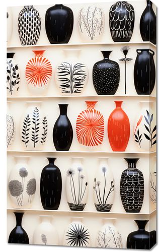 Obraz z serii wnętrza zatytułowany Gliniana Harmonia. Precyzyjnie ułożone wazony na półkach prezentują się niczym w muzeum sztuki użytkowej. Ich geometryczne i roślinne wzory, oscylujące między czernią, bielą i czerwienią, tworzą hipnotyzującą kompozycję. Prostota i elegancja tych przedmiotów, w połączeniu z ich zróżnicowaną fakturą i wzornictwem, dodają wnętrzom niepowtarzalnego charakteru. Idealnie komponują się zarówno w nowoczesnych loftach, jak i tradycyjnych pokojach kolekcjonera. Ta estetyczna kolekcja doskonale odda atmosferę w galeriach designu oraz w ekskluzywnych salonach z antykami.