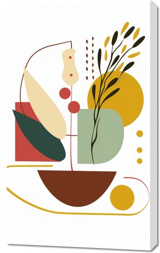 Obraz z serii minimalistyczne zatytułowany Harmonia Natury Martwej. Grafika ta to nowoczesna interpretacja klasycznego motywu natury martwej, gdzie geometryczne formy łączą się z delikatnymi roślinnymi akcentami. Paleta barw jest ciepła i ziemista, z akcentami głębokiego czerwieni, spokojnych zieleni i musztardowych żółci, wszystkie umieszczone na jasnym tle, co nadaje pracy subtelność i lekkość.Ten obraz świetnie komponuje się z wnętrzami, które cenią sobie spokój i równowagę, a także z przestrzeniami, które chcą wnieść do swojego otoczenia sztukę inspirowaną naturą. Może być wyjątkowym dodatkiem do salonu, przestrzeni relaksacyjnej, czy jako estetyczny akcent w jadalni.