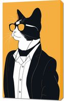 Obraz z serii abstrakcja zatytułowany Jegomość to stylizowany portret kota w ludzkim ubiorze. Charakterystyczne, czarno-białe ubarwienie kota zostało podkreślone przez elegancki, czarny garnitur z białą koszulą oraz modnymi, żółtymi okularami, które dodają postaci wyrafinowanego uroku. Tło w intensywnym odcieniu musztardy idealnie komponuje się z całością, nadając plakatowi ciepły i wyrazisty charakter. Silny profil kota, wyraźne linie i minimalistyczne podejście do szczegółów czynią ten obraz zarówno zabawnym, jak i eleganckim, idealnym do przestrzeni, które cenią sobie humor i styl, takich jak nowoczesne biura, domowe biblioteki czy saloniki.