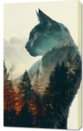 Obraz z serii natura zatytułowany Koci Duch Lasu. Ten obraz prezentuje zaskakującą kompozycję, w której sylwetka czarnego kota płynnie przechodzi w mglisty krajobraz leśny, łącząc świat zwierzęcia z dziką przyrodą. Złote i ciepłe odcienie jesiennego lasu w tle kontrastują z chłodnymi tonami gór, dodając głębi i tajemniczości. Mistyczne połączenie kota z naturą symbolizuje jedność i harmonię między żywymi istotami a otoczeniem, a także podkreśla dziką i niezależną naturę kota. Obraz idealnie nadaje się do przestrzeni mieszkalnych ceniących połączenie sztuki z naturą, takich jak nowoczesne salony, pokoje relaksacyjne lub gabinety, jak również może być inspirującym elementem dekoracyjnym dla gabinetów weterynaryjnych lub przychodni zoologicznych.