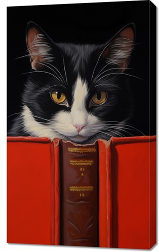 Obraz z serii wnętrza zatytułowany Koci Uczeń. Prezentuje on uroczego, czarno-białego kota z intensywnie żółtymi oczami, zaglądającego ciekawie do czerwonej, otwartej książki. Głęboki czarny tło podkreśla barwy i szczegółowe detale futra kota, a także złocenia na grzbiecie książki. Ten obraz łączy w sobie humor i ciepło, doskonale oddając osobowość i charakter kotów jako towarzyszy domowych. Idealny do umieszczenia w domowych bibliotekach, salonach czy pokojach dziecięcych, plakat ten dodaje wnętrzu przytulności i wprowadza zabawny, intelektualny element.