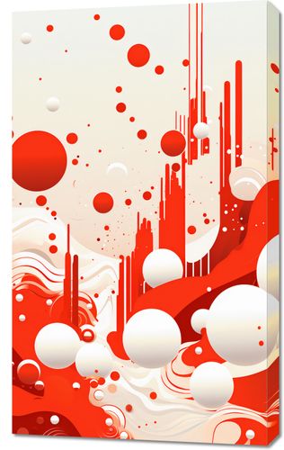 Obraz z serii abstrakcja zatytułowany Krwiście Czerwone Wibracje. Energetyczne kule i linie w tonacjach czerwieni i bieli tworzą wizualną symfonię, która pobudza zmysły. Gładkie fale łączą się z ostrymi, pionowymi liniami, tworząc uczucie ruchu i pulsacji. Czerwone krople unoszą się jak planety w kosmicznej przestrzeni, dodając obrazowi głębi i dynamiki. Jego odważny i nowoczesny design dodaje nuty świeżości i innowacyjności. Doskonale pasuje do nowoczesnych biur, studiów projektowych oraz przestrzeni artystycznych, gdzie kreatywność spotyka się z technologią.