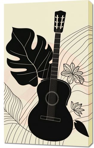 Obraz z serii minimalistyczne zatytułowany Melodyjność Natury przedstawia czarną sylwetkę gitary ukulele, która wyróżnia się na tle w pastelowych odcieniach beżu z delikatnymi akcentami botanicznymi. Naturalne kształty liści monstery i subtelne linie florystycznych wzorów tworzą relaksujące, ale jednocześnie żywe tło, które idealnie komplementuje centralny motyw muzyczny. Ta artystyczna kompozycja oddaje hołd zarówno muzyce, jak i naturze, wprowadzając do wnętrza atmosferę spokoju i harmonii. Idealnie nadaje się do przestrzeni wypoczynkowych, studiów muzycznych lub jako dekoracyjny akcent w salonie miłośnika muzyki.