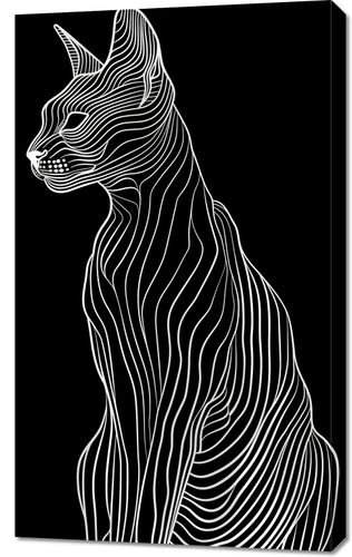 Obraz z serii abstrakcja zatytułowany Minimalny Kontur prezentuje minimalistyczny i stylowy wizerunek kota, wykonany w technice linii konturowych. Czyste, białe linie o zróżnicowanej grubości tworzą sylwetkę kota na jednolitym, czarnym tle, dając efekt elegancji i prostoty. Kompozycja skupia się na gracją i wyrafinowaną postawę kota, z wyraźnie zaznaczonymi uszami, oczami i kształtem ciała. Całość tworzy hipnotyzujący obraz, który jest zarazem współczesny i ponadczasowy, idealny dla miłośników minimalizmu, a także dla tych, którzy cenią sobie kreatywne podejście do tradycyjnego portretowania zwierząt. Obraz ten świetnie wkomponuje się w nowoczesne wnętrza, stanowiąc subtelny, ale wyrazisty akcent dekoracyjny.