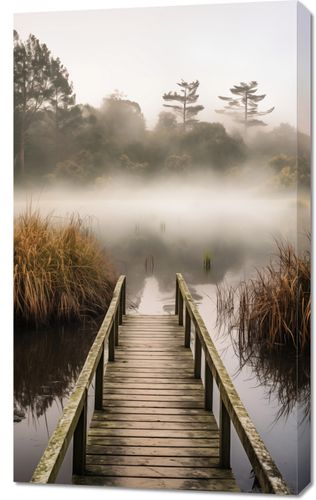 Obraz z serii pejzaże zatytułowany Most do Tajemnicy. Na tym mistycznym obrazie drewniana kładka prowadzi nas ku tajemniczej mgle, która delikatnie spowiła powierzchnię spokojnego stawu. Złote trzciny i zarysy drzew rzucają się w oczy na tle zamglonego poranka, tworząc uczucie ciepła i spokoju. Ten obraz oddaje piękno niewidzialnego świata, który czai się tuż za zasłoną mgły, zachęcając widza do refleksji i odkrywania nieznanego. Idealnie nadaje się do wnętrz, gdzie dominuje natura i spokój, takich jak salony spa, pokoje relaksacyjne, czy prywatne biblioteki. To wyjątkowy element dekoracyjny, który może przynieść element kontemplacji i odprężenia do każdego domu lub przestrzeni publicznej.