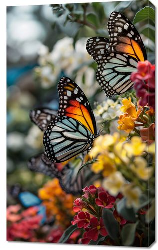 Obraz z serii natura zatytułowany Motyle Na Łące. Na obrazie widnieje trio monarchów, które z gracją spoczywają na kwitnących kwiatach, ich pomarańczowo-czarno-białe skrzydła wyłaniają się z tła pełnego barw i życia. Delikatne odcienie kwiatów w różnych odcieniach żółci, czerwieni i pomarańczy podkreślają naturalne piękno i delikatność motyli, a rozmyte tło nadaje kompozycji głębi i subtelności. Ten obraz jest celebracją życia i przemijania, idealnym do wnętrz, które pragną odzwierciedlić piękno i efemeryczność przyrody, jak salony, spa, czy pokoje wypoczynkowe.