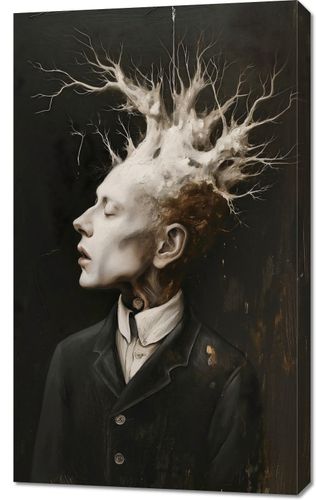 Obraz z serii abstrakcja zatytułowany Myśli Wzrastające prezentuje surrealistyczny portret mężczyzny, z którego głowy wyłania się skomplikowana struktura przypominająca korzenie lub gałęzie drzewa. Ten organiczny koronament wyrasta z myśli postaci, symbolizując rozwój, kreatywność i złożoność ludzkiego umysłu. Kontrast między żywą bielą i szarościami struktury a głębokim, ciemnym tłem sugeruje głębię i intensywność wewnętrznego świata postaci. Ten obraz może stanowić mocny wizualny akcent w przestrzeniach takich jak galerie, artystyczne pracownie, gabinety psychologiczne, a także we wnętrzach osób ceniących głębokie, filozoficzne refleksje.