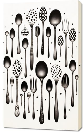 Obraz z serii wnętrza zatytułowany Narzędzia Smaku. Eleganckie sylwetki sztućców w różnorodnych kształtach i wzorach, podkreślane przez subtelne detale i geometryczne punkty, tworzą harmonijną i równocześnie zaskakującą kompozycję. Czarne i białe tony nadają prostotę i wyrafinowanie, podczas gdy unikalne projekty sztućców dodają nuty kreatywności i innowacji. Idealnie sprawdzi się w nowoczesnych kuchniach, restauracjach o minimalistycznym designie oraz w przestrzeniach dedykowanych sztuce kulinarnej.