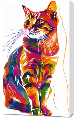 Obraz z serii abstrakcja zatytułowany Nasycony Kot prezentuje kota w stylu pop art, którego futro jest kolażem żywych i nasyconych kolorów, tworząc wizualnie hipnotyzujący efekt. Wzrok kota, z głębokimi i bystrymi oczami, wydaje się śledzić coś poza ramą obrazu, dodając tajemniczości i życia tej grafice. Ekspresyjne linie i kształty, które definiują postać, są odważne i dynamiczne, co podkreśla niezależny charakter zwierzęcia. Ta energetyczna i barwna ilustracja przyciąga wzrok i jest doskonałym dodatkiem do nowoczesnych przestrzeni, które chcą dodać odrobiny kreatywności i koloru, idealna do salonów, studiów artystycznych lub pokoi młodzieżowych.