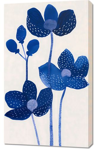 Obraz z serii wnętrza zatytułowany Nocne Kwiaty to odważne, graficzne przedstawienie kwiatów w monochromatycznej palecie kolorów granatowych. Kwiaty o stylizowanych formach i różnorodnych fakturach wyłaniają się na tle w delikatnym odcieniu, co dodaje kompozycji spokojnego, ale zarazem wyrazistego charakteru. Sploty i kropki na płatkach kwiatów tworzą iluzję głębi i tekstury, a ich symetryczny rozmieszczenie nadaje plakatowi rytmicznej harmonii. Ten obraz jest wyrafinowany i współczesny, idealny dla przestrzeni szukających minimalistycznej, ale odważnej dekoracji ściennych, takich jak nowoczesne biura, eleganckie salony czy jako wyjątkowy element w galeriach sztuki.