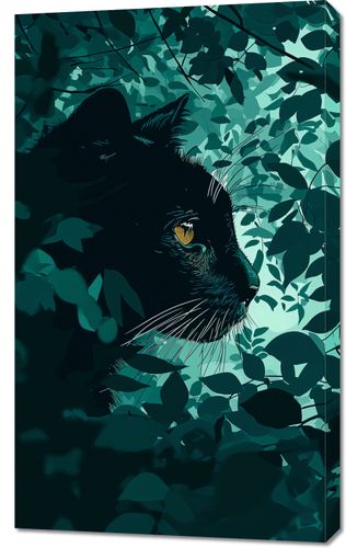 Obraz z serii wnętrza Oczekiwanie, przedstawia portret czarnego kota wtapiającego się w zielone liście. Artysta użył bogatej palety odcieni zieleni, aby stworzyć iluzję kota skrytego w gęstym listowiu, z wyraźnym, żółtym okiem, które przyciąga uwagę i daje wrażenie czujności i tajemniczości. Złożoność wzoru liści kontrastuje z prostotą cienia kota, co nadaje dziełu głębi i wielowymiarowości. Ten obraz byłby idealnym dodatkiem do każdego współczesnego wnętrza, które ceni subtelność i naturę, a także może być interesującym punktem centralnym w galerii sztuki lub przestrzeni wystawienniczej.