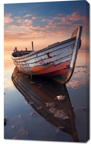 Obraz z serii pejzaże zatytułowany Odosobniona Przystań. Artystyczne zdjęcie przedstawiające opuszczoną łódź o zesztywniałych żaglach, dryfującą na spokojnych wodach przy zachodzie słońca. Odbicie łodzi w wodzie tworzy niemal doskonałe lustro, w którym łączą się niebo i morze, a zanikające kolory podkreślają upływ czasu. Złote i pastelowe odcienie zachodzącego słońca w tle nadają scenie uczucie nostalgii i spokoju. Obraz ten doskonale nadaje się do wnętrz o morskiej tematyce, takich jak nadmorskie chaty, a także jako akcent dekoracyjny w przestrzeniach, które pragną odzwierciedlić miłość do morza i żeglarstwa.