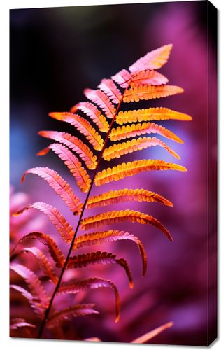 Obraz z serii natura zatytułowany Ogień Jesieni przedstawia pojedynczy liść paproci, który przechodzi przez spektrum ciepłych, jesiennych barw od żółci przez intensywną pomarańcz do głębokiego różu. Kontrastujące, żywe tło w odcieniach purpury podkreśla bogactwo i dynamikę liścia. Delikatne gradacje kolorów oraz wyraźna struktura paproci sprawiają, że obraz wydaje się niemal trójwymiarowy. Ta fotografia to idealny element dekoracyjny, który wprowadzi życie i ciepło do każdego wnętrza, nadając mu artystycznego charakteru. Doskonale sprawdzi się jako wyrazisty akcent w nowoczesnym salonie, sypialni lub biurze, szczególnie dla osób ceniących sobie naturę i jej niezwykłą paletę barw.