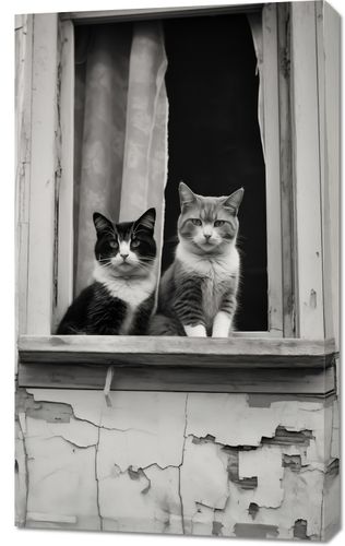 Obraz z serii wnętrza zatytułowany Para w Oknie. Uchwycenie momentu, w którym dwa koty o spokojnych i pełnych godności spojrzeniach pozują w oknie zaniedbanej fasady. Czarno-białe tło fotografii dodatkowo wzmacnia ich wyraziste, charakterystyczne wzory na sierści. Ten obraz to nie tylko urokliwa scena z życia miejskich kotów, ale również piękna metafora o spokoju i zgodzie, jaką można odnaleźć w najprostszych momentach codzienności. Obraz ten będzie wyjątkowym dodatkiem do każdego wnętrza, szczególnie polecany dla miłośników zwierząt i estetyki vintage, a także jako element ozdobny w kawiarniach czy księgarniach, który wnosi element ciepła i domowego klimatu.