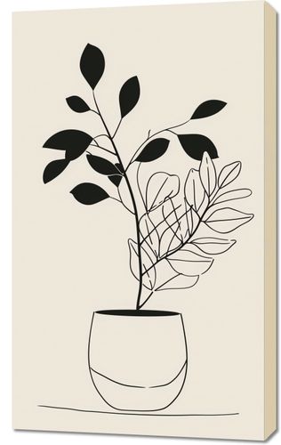 Obraz z serii minimalistyczne zatytułowany Prostota Doniczki. Obraz przedstawia elegancką kompozycję roślin w doniczce, narysowanych za pomocą czystych, prostych linii. Kontrastowe czarne liście na górze są zrównoważone przez delikatny zarys krzewu poniżej. Prosta doniczka o zaokrąglonych kształtach dodaje kompozycji nowoczesnego charakteru.Dzieło to wnoszące do wnętrza powiew świeżości i natury, jest idealnym wyborem dla przestrzeni, które cenią sobie spokój i czyste linie. Doskonale nadaje się do minimalizmu, skandynawskiego stylu mieszkania, biur, czy pokoi o jasnym wystroju, gdzie sztuka ma za zadanie uspokajać i przynosić harmonię.