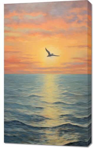 Obraz z serii pejzaże zatytułowany Serenada Nieba. Ten olśniewający obraz przedstawia moment, gdy ostatnie promienie dnia malują niebo w odcienie pomarańczy i różu, a pojedynczy ptak szybuje w stronę zachodzącego słońca. Morze rozciąga się aż po horyzont, odbijając złote światło, które nadaje scenie poczucie nieskończoności i spokoju. Doskonale nadaje się do wnętrz, które aspirują do stworzenia atmosfery spokoju i refleksji, takich jak salony, pokoje wypoczynkowe, czy przestrzenie wellness i spa.