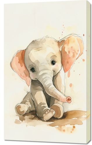 Obraz z serii wnętrza zatytułowany Siwy Słonik to czarująca akwarela przedstawiająca małego, siwego słonia z dużymi, wyrazistymi oczami i rozłożystymi uszami w odcieniach różu. Delikatność i ciepło ilustracji wydobywają ujmującą niewinność młodego słonia. Rozpryski akwareli wokół postaci dodają dynamiki i lekkości, sugerując radosną zabawę i beztroskę. Ten obraz wprowadza atmosferę spokoju i radości, idealnie nadają się do ozdobienia przestrzeni dziecięcej, takiej jak pokoje maluchów, przedszkola, sale zabaw czy kąciki czytelnicze w bibliotekach. Jego urokliwy obraz może inspirować młode umysły do marzeń i pozytywnego myślenia.