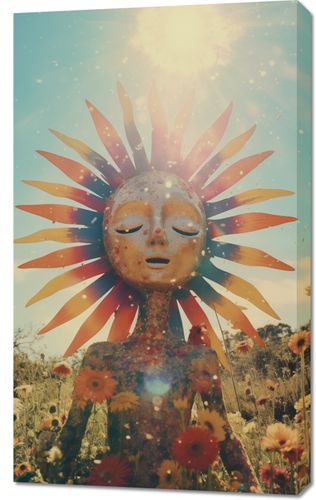 Obraz z serii pop art zatytułowany Słoneczna Medytacja. Ta inspirująca grafika przedstawia statuę medytującej postaci z aureolą w kształcie słońca, symbolizującą spokój wewnętrzny i oświecenie. Postać, zanurzona w polu kwiatów, z zamkniętymi oczami i twarzą skierowaną ku słońcu, promieniuje spokojem i harmonią. Naturalne barwy ziemi oraz promienie słońca nadają kompozycji ciepła i głębi, tworząc uczucie jedności z naturą. Ten obraz będzie doskonałym dodatkiem do przestrzeni, które cenią sobie spokój i kontemplację, takich jak salony jogi, przestrzenie do medytacji lub jako relaksujący akcent w domowych wnętrzach.