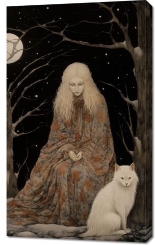Obraz z serii wnętrza zatytułowany Stróżka Leśna. Ta eteryczna praca artystyczna ukazuje postać kobiecą, owiniętą w szatę z motywem leśnym, zatopioną w kontemplacji pod gałęziami drzew oplecionych przez śnieg i w blasku pełnego księżyca. Jej spokojna obecność i blady odcień skóry kontrastują z ciemnością nocy, a towarzyszący jej biały wilk dodaje elementu dzikości i tajemniczości. Obraz oddaje uczucie spokoju i jedności z naturą, a jednocześnie wzbudza ciekawość dotyczącą ukrytych opowieści i starych legend. Idealny dla miłośników fantastyki, mitologii, oraz tych, którzy pragną wprowadzić do swojego wnętrza elementy oniryczne i magiczne.