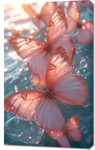 Obraz z serii natura zatytułowany Świetliste Motyle. Na obrazie widzimy delikatne motyle o przezroczystych, różowych skrzydłach, unoszące się nad wodą i łagodnie odbijające światło słoneczne. Kropelki wody na ich skrzydłach dodają uczucia świeżości i czystości. Obraz emanuje spokojem i pięknem, idealnie nadając się do przestrzeni, które chcą wprowadzić element relaksu i spokoju, takich jak spa, pokoje medytacyjne, a także jako łagodny element dekoracyjny do domu.