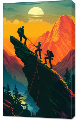 Obraz z serii abstrakcja zatytułowany U Szczytu przedstawia grupę wędrowców wspólnie zdobywających szczyt górski przy zachodzie słońca. Scena jest nasączona żywymi odcieniami pomarańczy i czerwieni, które tworzą dramatyczny, ale piękny kontrast z ciemnozielonymi drzewami i skalistym terenem. Sylwetki wędrowców są w centrum kompozycji, wyraźnie zarysowane przeciwko tłu światła słonecznego, co podkreśla ich osiągnięcie i trud włożony w zdobycie szczytu. Przepiękny zachód słońca z dużym, jasnym słońcem na horyzoncie nadaje całej scenie uczucie spokoju i spełnienia. Obraz ten oddaje ducha przygody i piękno natury, idealny dla miłośników gór i tych, którzy cenią siłę ludzkiego ducha. Doskonały do dekoracji ścian w domach, schroniskach górskich lub jako inspiracja w przestrzeniach, gdzie docenia się przyrodę i aktywny tryb życia.