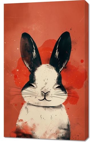 Obraz z serii abstrakcja zatytułowany Uśmiech! przedstawia wizerunek królika w stylistyce inspirowanej street art'em. Tło w ciepłej, czerwonej kolorystyce jest pokryte energicznymi plamami i rozpryskami farby, nadając dynamizmu całości kompozycji. Królik jest przedstawiony frontowo, z głową skierowaną prosto na widza. Jego uszy są wyraziste, czarne z białymi akcentami, co daje efekt trójwymiarowości. Urocza twarz zwierzęcia z subtelnym uśmiechem i charakterystycznymi wąsami wydaje się emanować spokojem i ciepłem. Detale takie jak tekstura futra królika są zaznaczone delikatnymi liniami i cieniowaniem, co dodaje realizmu i głębi grafice. Obraz ten sprawdziłby się jako dekoracja w przestrzeniach współczesnych, które cenią sobie oryginalność i lekkość wizualną, a jednocześnie wprowadza przytulny, domowy nastrój.