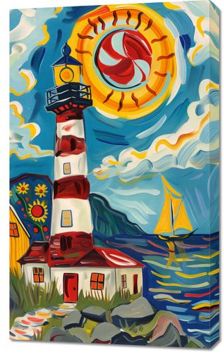 Obraz z serii abstrakcja zatytułowany Żywa Przystań to wesoła i barwna ilustracja przedstawiająca latarnię morską w nadmorskim pejzażu. Wyraziste, kręte linie i żywe kolory nadają scenie energii i ruchu, a dynamiczne słońce z żaglówką na tle morskich fal tworzy optymistyczny obraz. Latarnia morska, z jej klasycznymi czerwono-białymi pasami, stoi dumnie obok uroczego żółtego domku, a całość jest otoczona przez stylizowane kwiaty i roślinność. Styl przypomina ekspresjonistyczne dzieła z początku XX wieku, pełne życia i radości. Ten obraz jest idealny do rozjaśnienia każdego pomieszczenia, nadając mu ciepła i pozytywnej energii, świetnie sprawdzi się w przestrzeniach takich jak salony, pokoje dziecięce czy miejsca publiczne, gdzie może wprowadzić atmosferę spokoju i radosnego spędzania czasu.