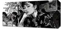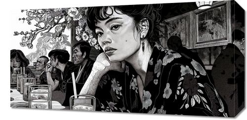 Obraz z serii motywy wschodnie zatytułowany Czarne Kimono. Przedstawia on czarno-białą scenę w restauracji, w której centralną postacią jest młoda kobieta o intensywnym spojrzeniu, ubrana w tradycyjny, kwiecisty kimono. Jej postać wyróżnia się na tle pozostałych gości, a szczegółowa grafika podkreśla wyraźne detale jej stroju i delikatnych rysów twarzy. Tło, zdobione motywem kwiatowym, nadaje głębi i kontekstu kulturowego, a całość kompozycji wywołuje atmosferę introspekcji i spokoju. Ten obraz idealnie nadaje się do wnętrz, które chcą oddać hołd klasycznej estetyce Dalekiego Wschodu lub po prostu wprowadzić element zastanowienia i piękna. Doskonale wpasuje się w przestrzenie takie jak salon, gabinet, a nawet miejsca publiczne, które pragną zapewnić swoim gościom wizualny odpoczynek i chwilę zadumy.