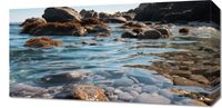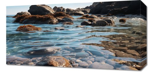 Obraz z serii pejzaże Harmonia Przybrzeżna przedstawia idylliczną scenę nadmorskiego krajobrazu, gdzie spokojne, krystalicznie czyste wody delikatnie odbijają skaliste wybrzeże. Skały pokryte morskimi wodorostami i okrągłe kamienie na pierwszym planie stanowią kontrast dla miękkiej tekstury wody. To artystyczne dzieło przypomina o naturalnej elegancji i spokoju, jakie można znaleźć w naturze. Obraz doskonale wpasuje się w przestrzenie pełne naturalnego światła i organicznych elementów, takie jak salon z widokiem na morze, gabinet relaksacyjny, czy przestrzeń wellness w luksusowym hotelu czy spa.