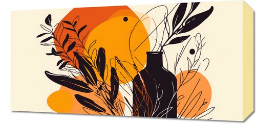 Obraz z serii minimalistyczne zatytułowany Jaskrawy Zachód. Na grafice widnieje silnie stylizowany motyw roślinny, gdzie czarne sylwetki roślin kontrastują z jaskrawo pomarańczowym i żółtym tłem, przypominającym zachodzące słońce. W tle pojawiają się delikatne, abstrakcyjne linie i kształty, dodające kompozycji głębi i tekstury.Ten plakat doskonale wpasuje się w wnętrza ożywione roślinnością, zarówno te domowe, jak i komercyjne przestrzenie typu kawiarnie lub sklepy z roślinami. Jego ciepłe barwy będą wprowadzać przytulną atmosferę i mogą stanowić żywy akcent w przestrzeniach utrzymanych w naturalnej kolorystyce.