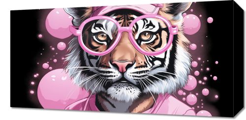 Obraz z serii pop art Ludzki Tygrys. Na obrazie widzimy głowę tygrysa, który jest ubrany w stylizowany, ludzki sposób. Tygrys ma na sobie różową czapkę z daszkiem oraz okulary w tym samym kolorze, co dodaje mu ludzkiego charakteru. Tło obrazu jest proste, pokryte bąbelkami w różnych odcieniach różu, co tworzy zabawny i lekko surrealistyczny klimat. Ten kolorowy i kreatywny projekt może przyciągnąć uwagę w różnorodnych przestrzeniach, od młodzieżowych pokoi po galerie sztuki. Jest to doskonały przykład współczesnego połączenia natury i kultury pop, który może być tematem rozmów i oryginalnym elementem dekoracyjnym.
