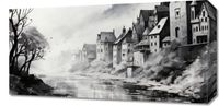 Obraz z serii pejzaże zatytułowany Mglisty Refleks. Misterne pociągnięcia pędzla przedstawiają starą wieś schowaną w mrocznych zakątkach gór, z dominującymi wieżami kościoła wznoszącymi się nad nią. Mgła otulająca krajobraz i odbicie w spokojnej wodzie tworzą atmosferę tajemniczości i zadumy. Monochromatyczna paleta barw dodaje głębi i intensywności całemu obrazowi, czyniąc go idealnym wyborem dla klasycznych salonów oraz miejsc takich jak kawiarnie o historycznym charakterze czy ekskluzywne kluby dyskusyjne.