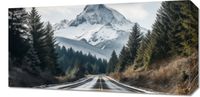 Obraz z serii pejzaże zatytułowany Odważna Podróż, przedstawia majestatyczną górę wyłaniającą się z pośród ciemnozielonych drzew iglastych, które wyznaczają drogę prowadzącą w kierunku jej śnieżnego szczytu. Siła i niezachwiana postawa góry w połączeniu z miękkimi konturami puchowych chmur nad nią tworzą doskonałą równowagę między wytrwałością a delikatnością. Czarna, wilgotna nawierzchnia drogi, rozświetlona światłem odbijającym się od jej wilgotnej powierzchni, prowadzi wzrok obserwatora wprost do serca dzikiej przyrody. Kontrast między ciemnymi drzewami a bielą śniegu dodaje dziełu głębi i tajemniczości. Ten obraz będzie idealnym dodatkiem do wnętrz o tematyce przygodowej i eksploracyjnej, jak również doskonałym wyborem dla przestrzeni biurowych firm turystycznych lub agencji podróżniczych, gdzie może inspirować i przypominać o majestacie i pięknie niezbadanych zakątków świata.