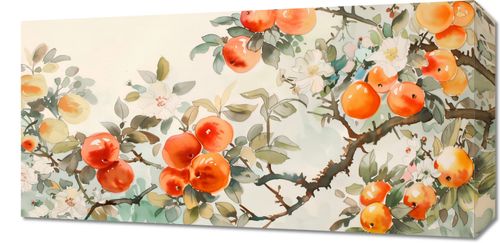 Obraz z serii abstrakcja zatytułowany Persymony. Przedstawia delikatną i kolorową ilustrację gałęzi owocowych w stylu azjatyckiej akwareli. Na obrazie widzimy rozkwitające kwiaty oraz dojrzałe, soczyste owoce persymony których intensywna pomarańczowa barwa jest pięknie wyeksponowana na tle pastelowych kolorów. Liście i gałęzie są przedstawione z subtelnymi niuansami zieleni i brązów, co dodaje głębi i naturalnego charakteru scenie. Ta sztuka łączy w sobie tradycyjne motywy i techniki malarskie z nowoczesnym podejściem do koloru i kompozycji, co czyni ją zarówno klasyczną, jak i współczesną. Obraz ten idealnie nadawałby się do przestrzeni, które cenią spokój i harmonię, takich jak salony relaksacyjne, gabinety spa, czy jako wyrafinowany akcent w domowej jadalni.