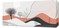 Obraz z serii boho zatytułowany Półcień Widoku.Obraz przedstawia oniryczny pejzaż, gdzie delikatne linie drzew przenikają przez łagodne, faliste wzgórza. Ciepłe odcienie czerwieni i różu przeplatają się z chłodniejszymi szarościami i czernią, tworząc poczucie głębi i spokoju. Subtelna tekstura na niektórych elementach dodaje wrażenia ruchu, a biała sfera w tle przywołuje skojarzenia z pełnią księżyca lub wschodzącym słońcem. Dzieło idealnie wpasuje się w wnętrza o spokojnym charakterze, takie jak stylowe sypialnie, czytelnie lub pokoje relaksacyjne. Może również przynieść element ukojenia i inspiracji do przestrzeni współpracujących, zapewniając wizualną odskocznię od codzienności. Zapewni miękki kontrast we wnętrzach urządzonych w naturalnych materiałach i odcieniach.