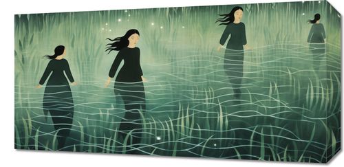 Obraz z serii wnętrza zatytułowany Pośród Ciszy, przedstawia grupę postaci kobiecych, poruszających się z gracją przez mglisty, oniryczny krajobraz. Zanurzone po kolana w wodzie, otoczone przez zielone, eteryczne trawy i dyskretnie świecące światła, postacie emanują spokojem i tajemniczością. Styl obrazu, z jego płynnymi liniami i spokojnymi odcieniami zieleni, tworzy uczucie medytacyjnej głębi i harmonii z naturą. Ten obraz idealnie nadaje się do wnętrz, które pragną odzwierciedlić głęboką spokojność i introspekcję, takich jak pokoje medytacyjne, strefy relaksu, domowe biblioteki, a także jako subtelny akcent w przestrzeniach publicznych, gdzie zachęca do chwili wytchnienia i refleksji.