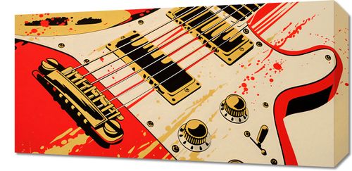 Obraz z serii abstrakcja zatytułowany Przed Graniem. Przedstawia zbliżenie na czerwoną gitarę elektryczną, której design jest wyrazisty i pełen energii. Widać detale instrumentu, takie jak przetworniki, potencjometry i struny, które są wyraźnie zaznaczone kontrastującymi kolorami złota, czerni i bieli na tle intensywnej czerwieni. Rozpryski i plamy farby na korpusie gitary nadają plakatowi surowy, rockowy charakter, co może sugerować żywiołowość i pasję muzyki granej na tym instrumencie. Ten obraz mógłby być atrakcyjnym elementem dekoracyjnym w przestrzeniach dedykowanych muzyce, takich jak sale prób, studia nagraniowe, pokoje młodzieżowe lub jako odważny akcent w nowoczesnym salonie.