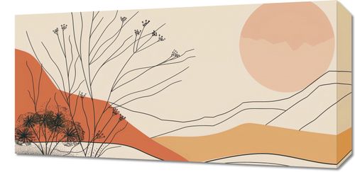 Obraz z serii boho zatytułowany Pustynna Wydma. Obraz ukazuje krajobraz z delikatnie zarysowanymi roślinami na tle łagodnych, pustynnych wydm. Spokojna kolorystyka, opierająca się na miękkich odcieniach beżu, pomarańczy i czerwieni, oddaje kojący klimat zmierzchu. W tle widoczne jest wielkie, ciepłe słońce, które rzuca złoty blask na całą scenę, nadając jej harmonijny charakter. Ten obraz będzie piękną dekoracją do wnętrz, które pragną wprowadzić elementy natury w połączeniu z minimalistycznym designem. Jego uspokajające barwy i proste linie idealnie wpasują się w przestrzenie takie jak sypialnie, salony, miejsca odpoczynku, czy nawet biura kreatywne, pragnące wykreować przestrzeń sprzyjającą relaksowi i inspiracji.
