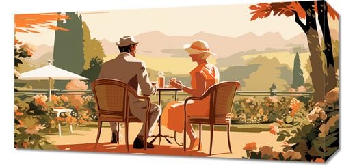 Obraz z serii abstrakcja zatytułowany Retro Randka, który przenosi nas w czasie do epoki art déco, gdzie elegancka para delektuje się popołudniową herbatą w zaciszu kwitnącego ogrodu. Ciepłe odcienie zachodzącego słońca tworzą romantyczną atmosferę, a stylizowana grafika podkreśla elegancję i wyrafinowanie epoki. Sylwetki postaci w modnych strojach tamtych lat oddają ducha minionych, beztroskich dni. Tło z rozległym widokiem na pagórkowate pejzaże i subtelnie zarysowane rośliny dodaje kompozycji głębi i spokoju. Ten obraz jest idealnym akcentem dla wnętrz inspirowanych vintage, dodając im klasy i nostalgii za światem sprzed lat.